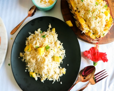 - Garnish with some cashew nuts, pineapple pieces, coriander and mint leaves.