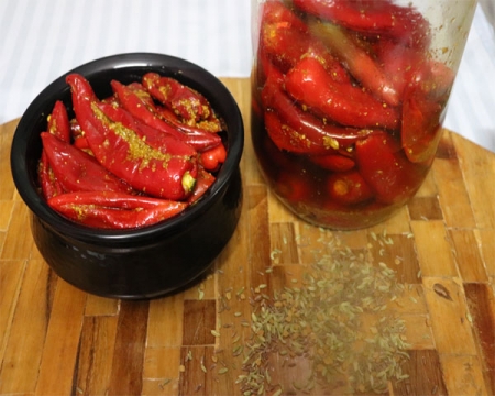 Take out the oil in a bowl. Dip each stuffed chili in oil and take out, keep it in a separate bowl.Fill up the sterilized container with the stuffed chili pickle. Put the leftover spice over the chilies, pour oil over them, then close lid of container.