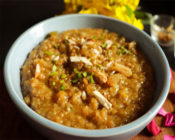 Heat ghee in a non-stick pan. Add gram flour , Sooji and cook till brown . Add moong dal, lower heat and mix well.