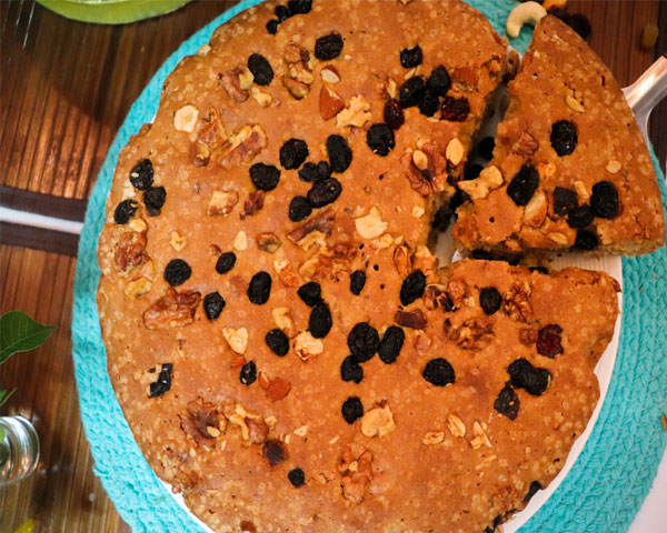 Pour the mixture into the prepared tin. Sprinkle some dry fruits and berries.