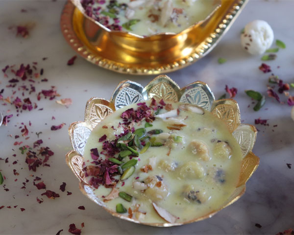 Garnish with fried cashews and raisins and rose petals.
